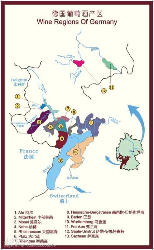 著名产区:主要为莱茵河及其支流莫塞尔河地区。莫塞尔酒的酒瓶是绿色的,而莱茵酒的酒瓶是茶色的。莱茵酒的口味更浓郁。