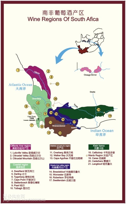 著名酒区:从大西洋海岸地区的北部一直延伸到沙漠,大约有340座酒窖和酒厂。开普有5个葡萄种植大区:coastal、oifanta河,boberg,breede河谷与klein、karoo地区,另外还有奥兰治河葡萄园及Loopspruit酒区。