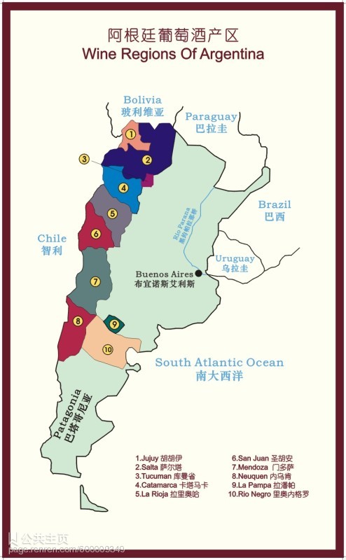 著名产区:San Juan,La Rioja,Rio Negro和Salt,最重要是Mendoza省,占全国总产量60%。其中最值得注意的是集聚了近400家酒厂,葡萄种植面积3万公顷的High Rio Mendoza Zone。