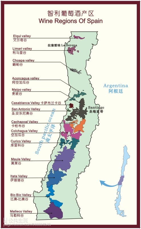 著名产区:Aconcagua天气暖和,以产苏维翁葡萄为主,Errazuriz是这里的大厂。区内的Casablanca山谷近年来名气也不小。
