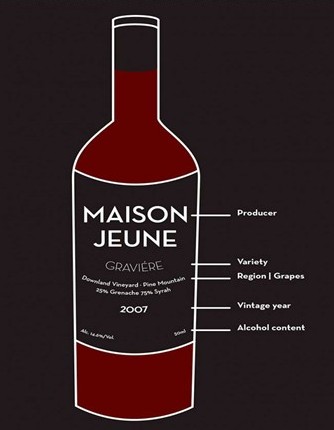 如图所示,瓶身上自上而下的文字为:生产商;酒的品种;产地;葡萄类型;生产年份。酒精含量位于最下方。