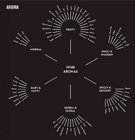 常见的酒香分六大类型:果香,矿物香,甜香和木香,辛香和味香,花香和草香,奶香和坚果香。上图分别给出了每一种香型包含的具体香味的名称,有兴趣的可以一一进行研究。